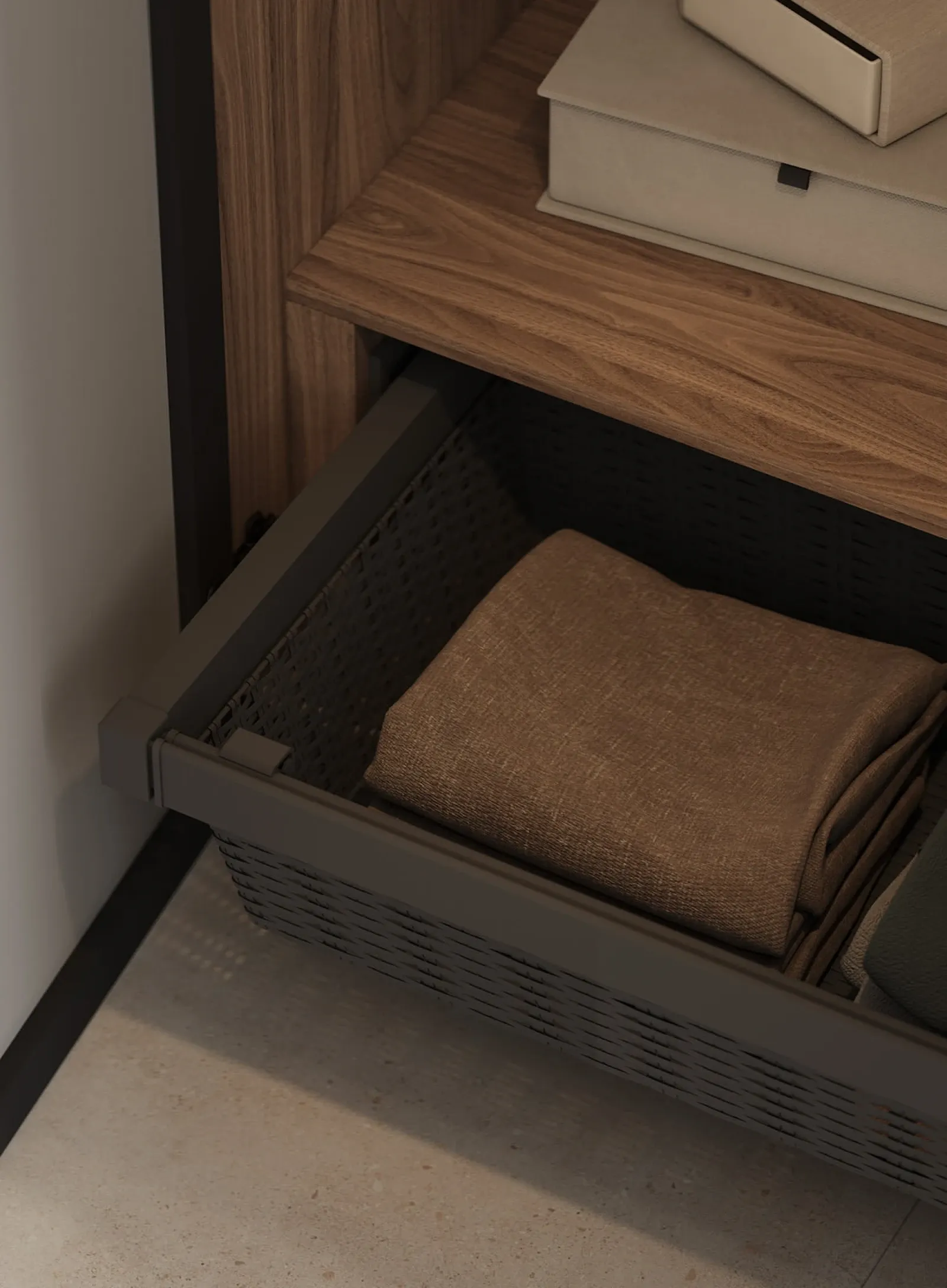 КАРКАС, ПОЛКИ, ВНУТРЕННИЕ ВЫДВИЖНЫЕ ЯЩИКИ, ЗАДНЯЯ СТЕНКА ЛДСП, декор Орех Карини Натуральный / Графит ФАСАДЫ Алюминиевый профиль А - 2 Терра Черная (ручка - профиль С - 5, угол запила 90˚), зеркало