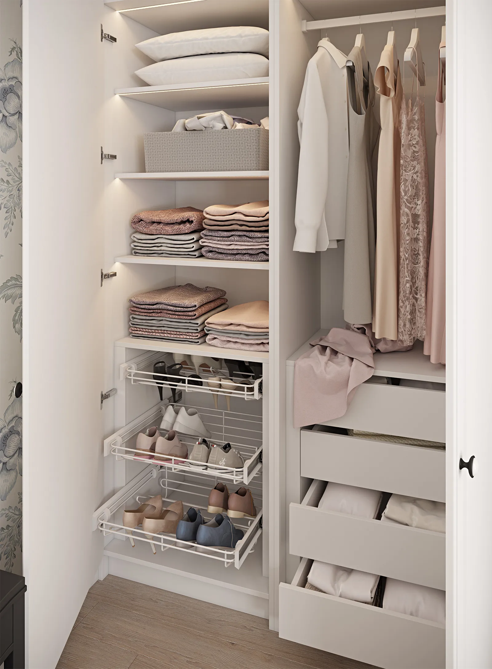 КАРКАС, ЗАДНЯЯ СТЕНКА, ПОЛКИ, ВЫДВИЖНЫЕ ЯЩИКИ ЛДСП Белый Премиум / Белый ФАСАДЫ Лонгфорд (МДФ / ПВХ), цвет Белый Супермат