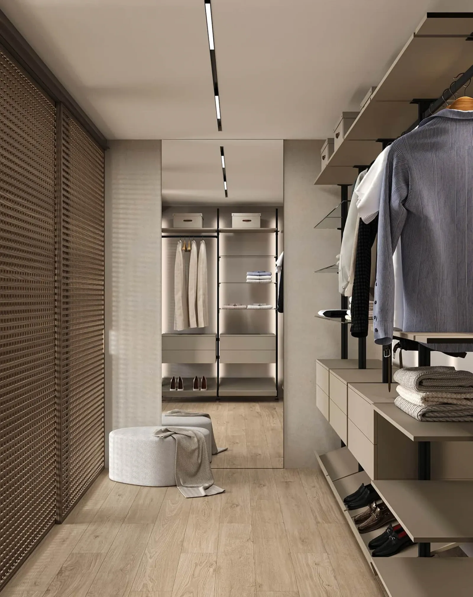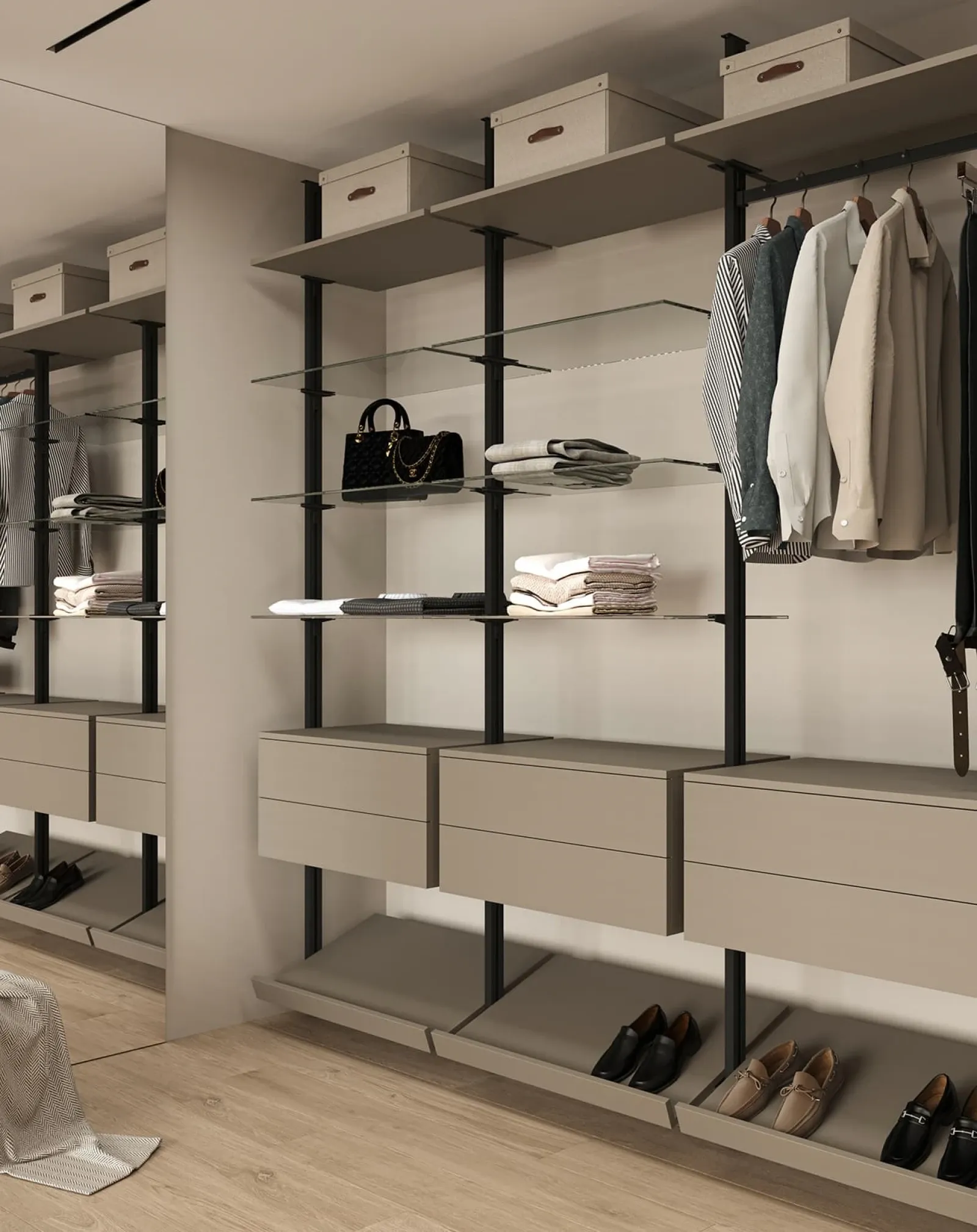 ОПОРНЫЙ ПРОФИЛЬ PA 02, цвет Черный Матовый НАВЕСНЫЕ ЭЛЕМЕНТЫ ЛМДФ SUPRAMAT (толщина 18 мм), цвет Сафари Супрамат, стекло прозрачное (толщина 6 мм)