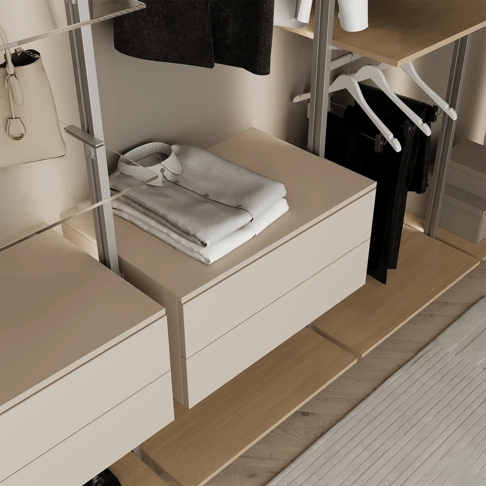 Навесные элементы: ЛМДФ (толщина 18 мм), декор Бежевый Супрамат / шпон дуба (толщина 19 мм), цвет #189 (масловоск Белый) / стекло прозрачное (толщина 6 мм)