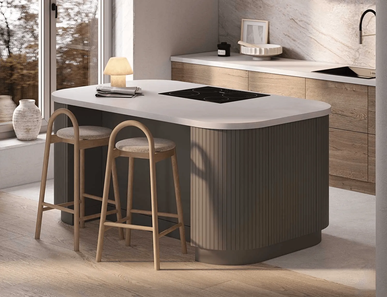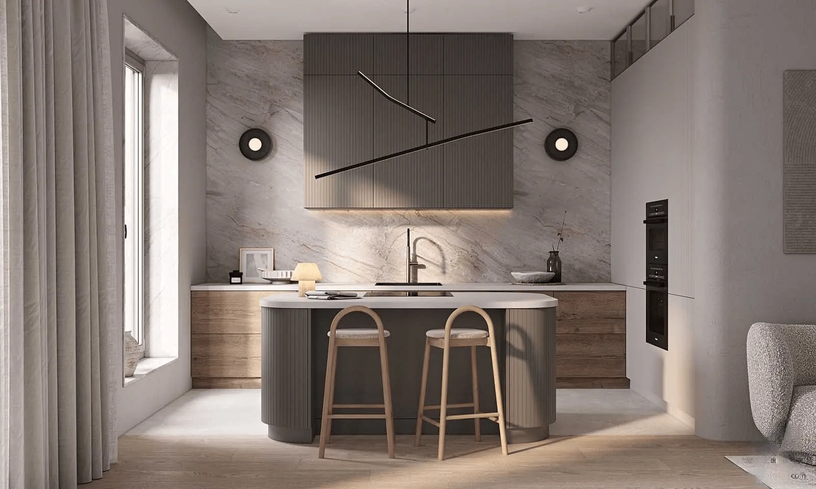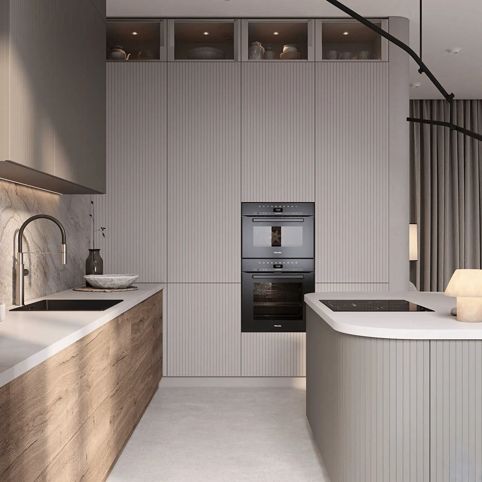Фасады: Аврора (крашеная МДФ), цвет NCS S 5005-G50Y / S 1500-N Матовый; ЛДСП Тимбер, декор Рока.