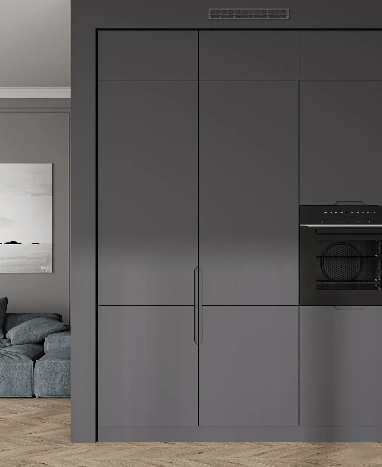 Однако, красота этой кухни не ограничивается только ее внешним видом. Каждый элемент этой кухни был продуман до мельчайших деталей с учетом функциональности и практичности использования. Шкафы и ящики оснащены системами плавного закрывания от HETTICH, что предотвращает неприятные звуки и обеспечивает долгий срок службы.