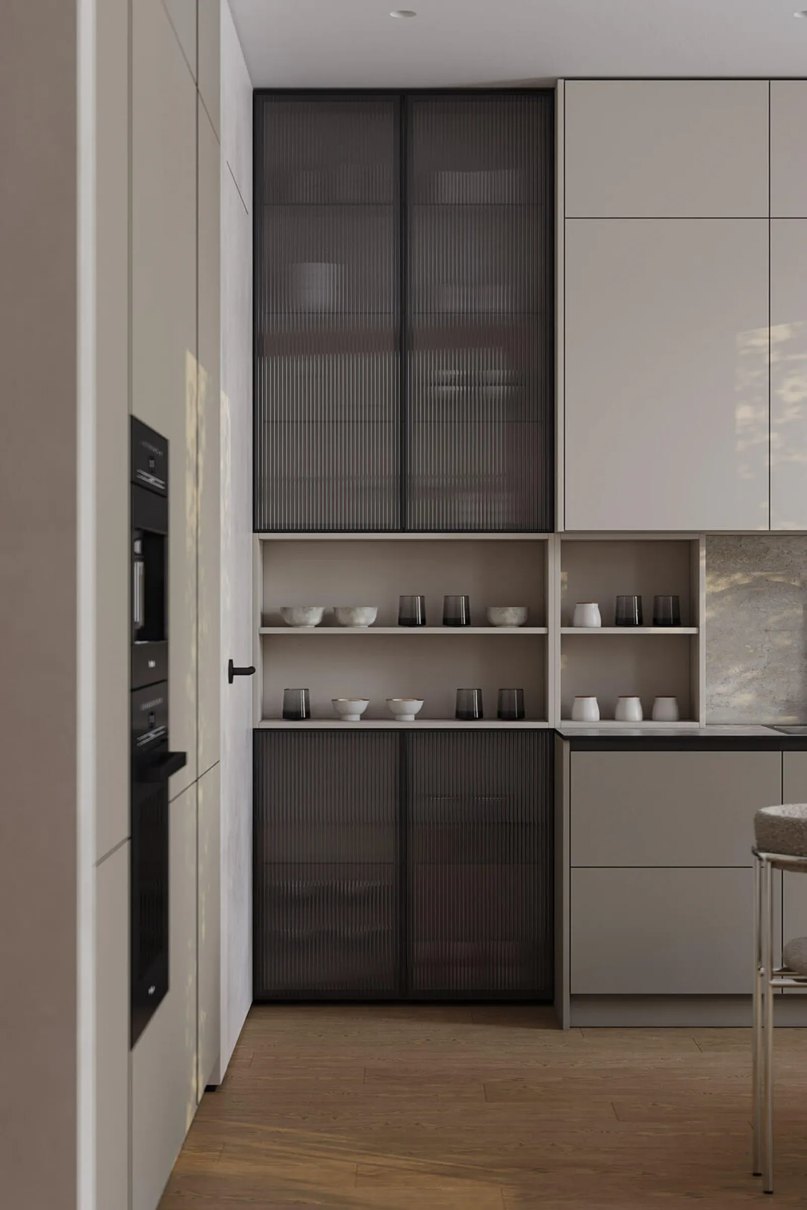 Витрины: Алюминиевый профиль А-6 Черный Матовый (скрытая петля AIR PUSH), стекло Тисненое-4 Графит прозрачное