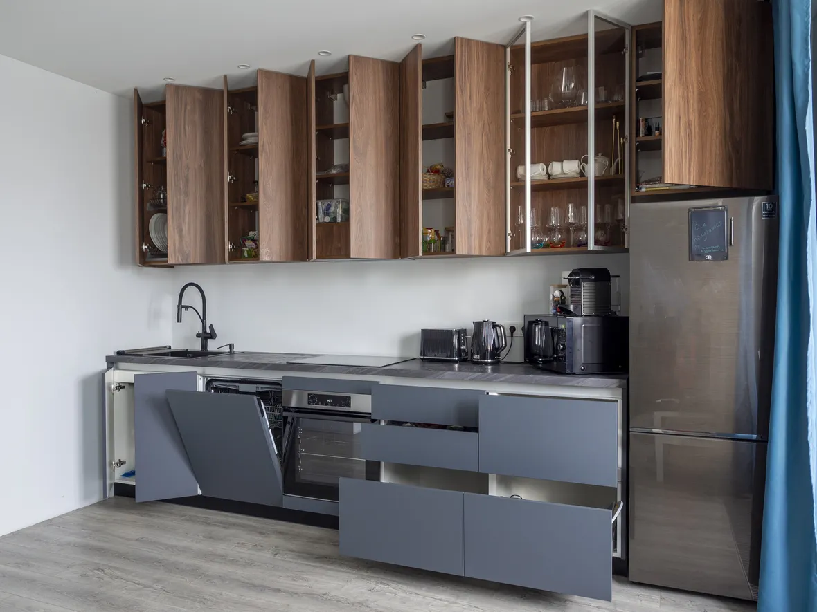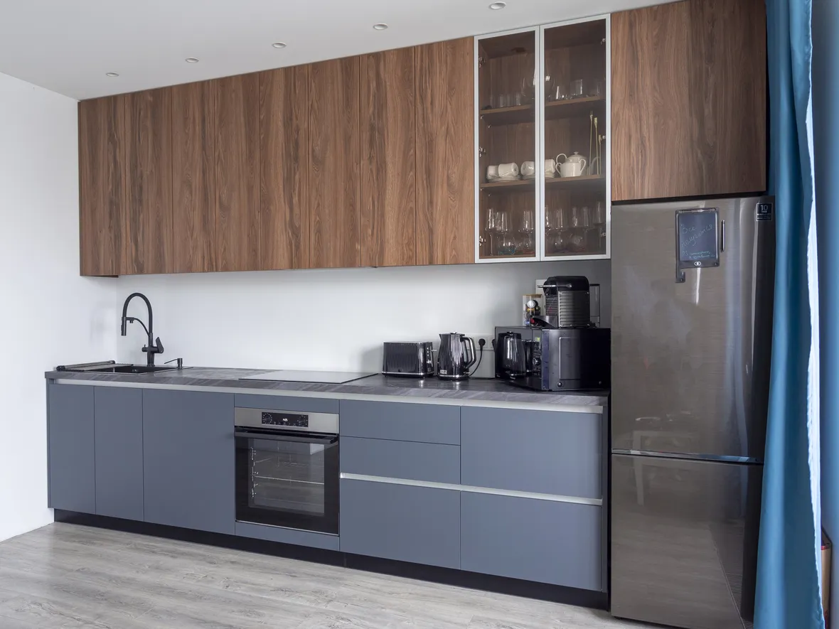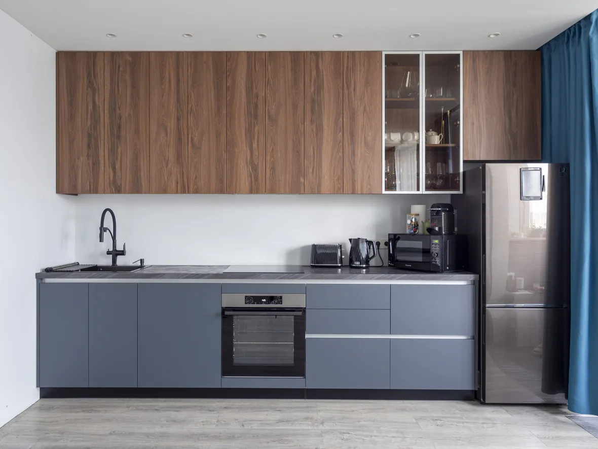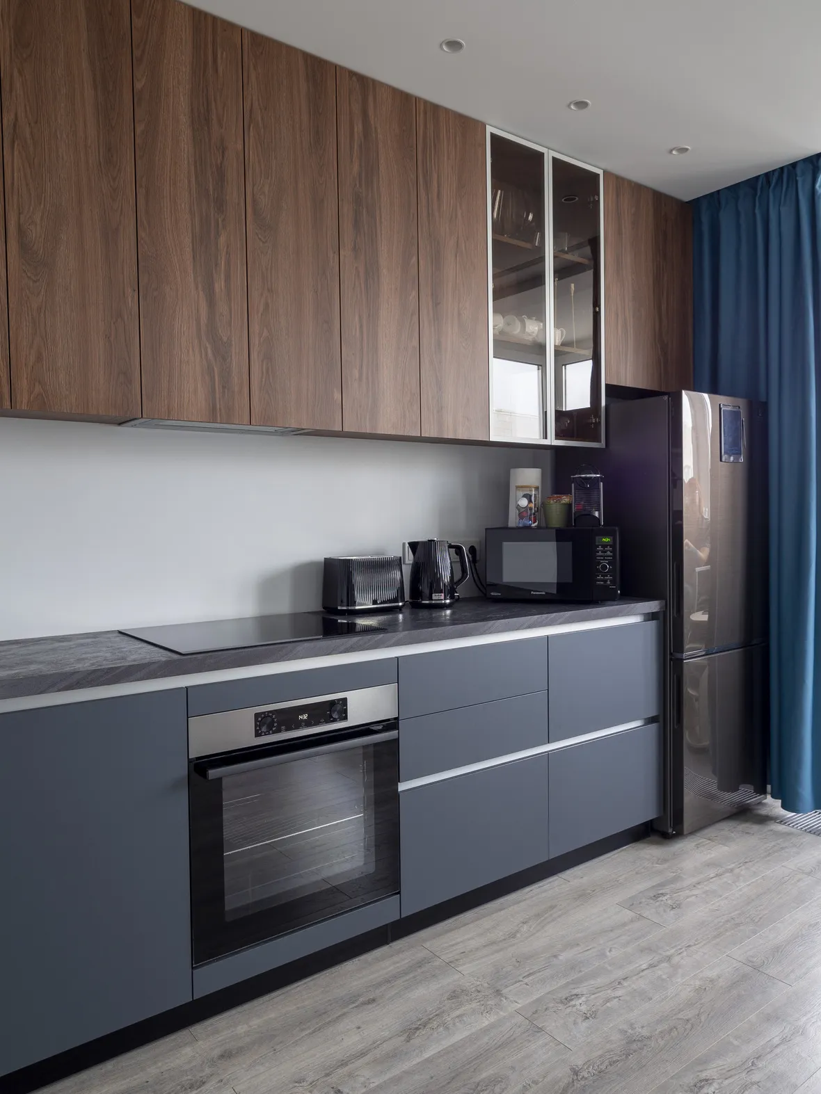 Фасад: Акрил-5 в цвете Темно-серый, Тимбер в цвете Марон