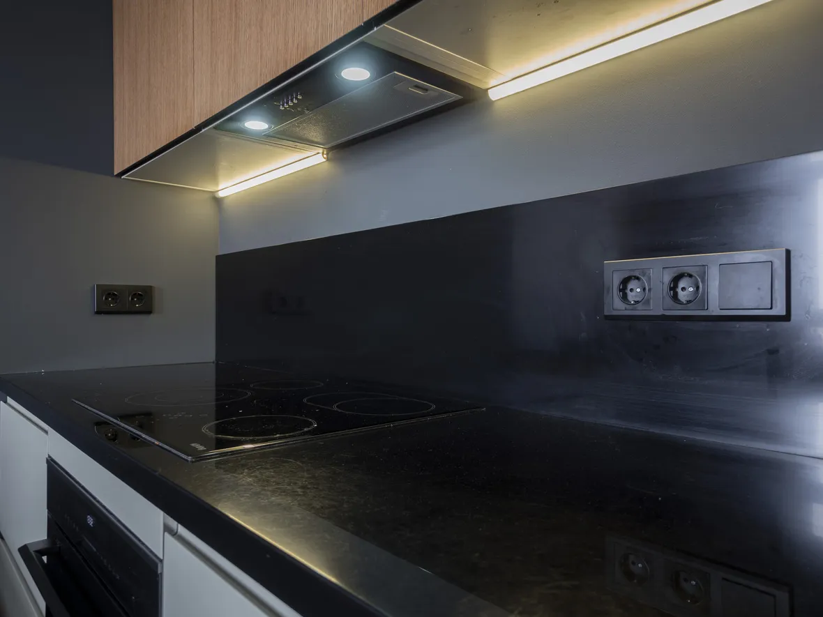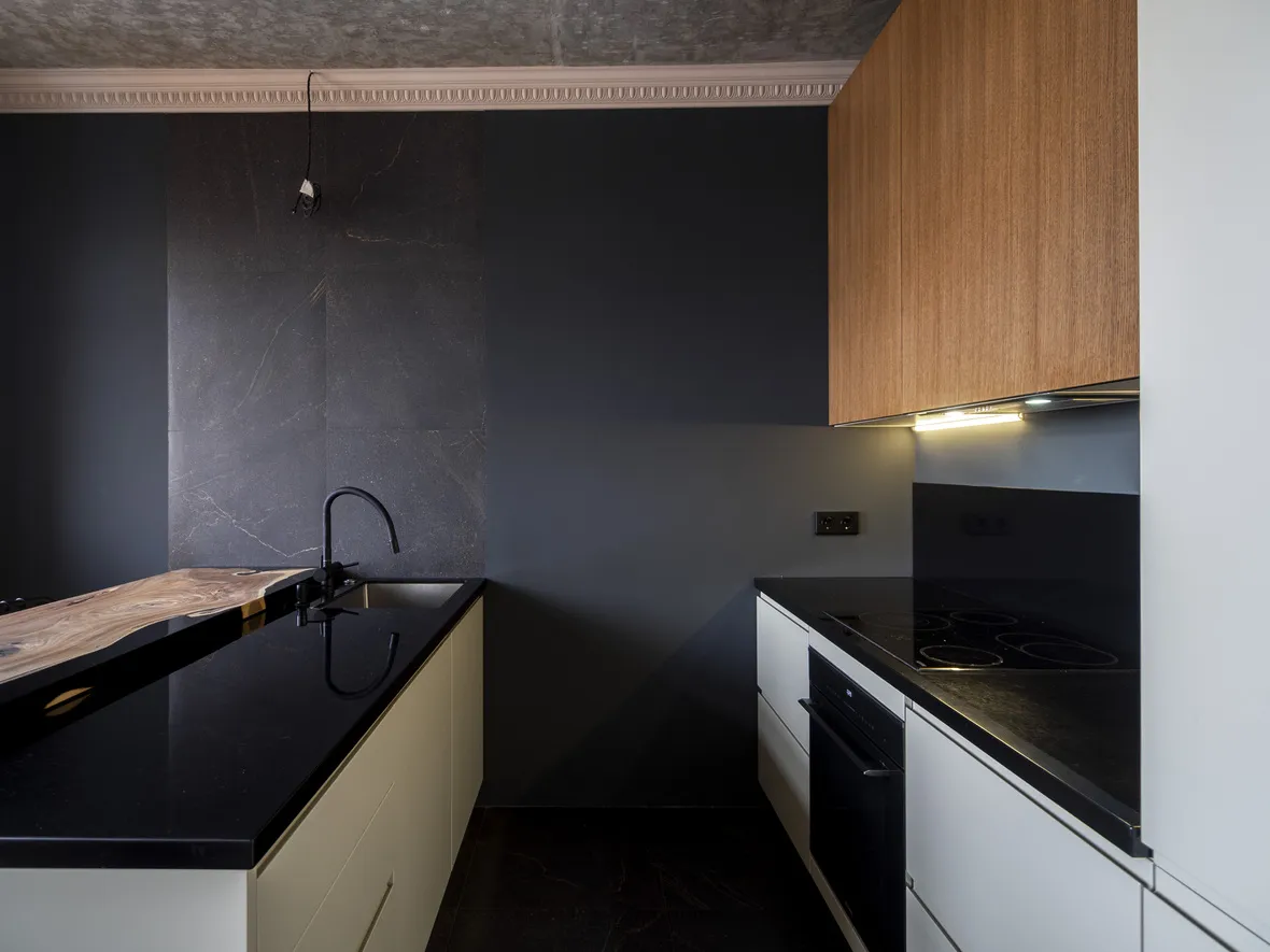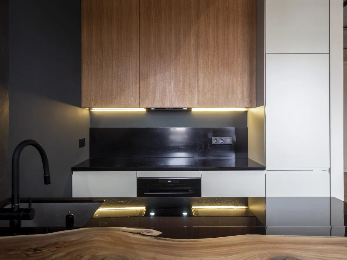 ТЕХНИКА: духовой шкаф, ПММ, встраиваемый холодильник, стирально-сушильная машина, варочная панель - KORTING; встраиваемая вытяжка - KRONA; мойка, смеситель, дозатор - EMAR; измельчитель пищевых отходов, сифон U-образный - BONE CRUSHER.